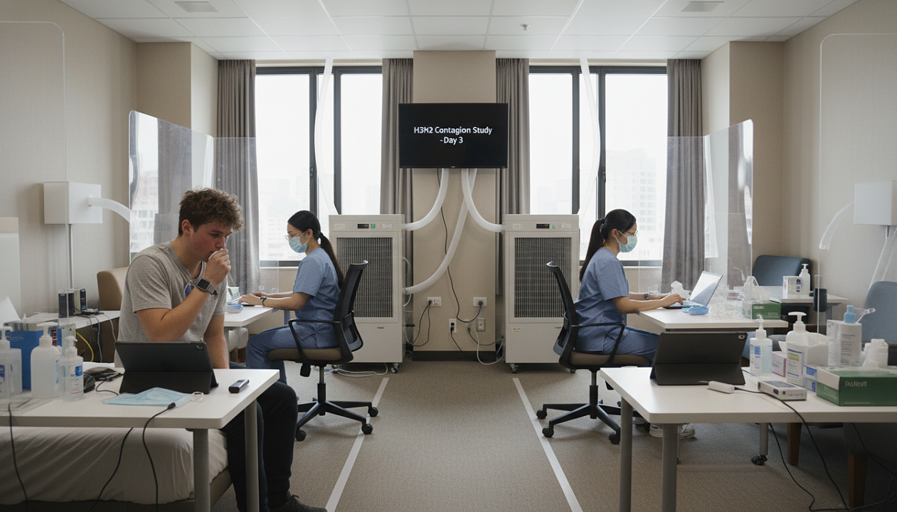 Целью данного исследования было изучение контагиозности штамма H3N3 с акцентом на факторы, способствующие или препятствующие передаче вируса. В эксперименте приняли участие 16 человек: 5 студентов колледжа, заболевших вирусом (средний возраст 21 год), и 11 здоровых добровольцев (средний возраст 36 лет). Все участники были размещены в отеле на двухнедельный карантин, что обеспечивало контроль над условиями взаимодействия между ними.